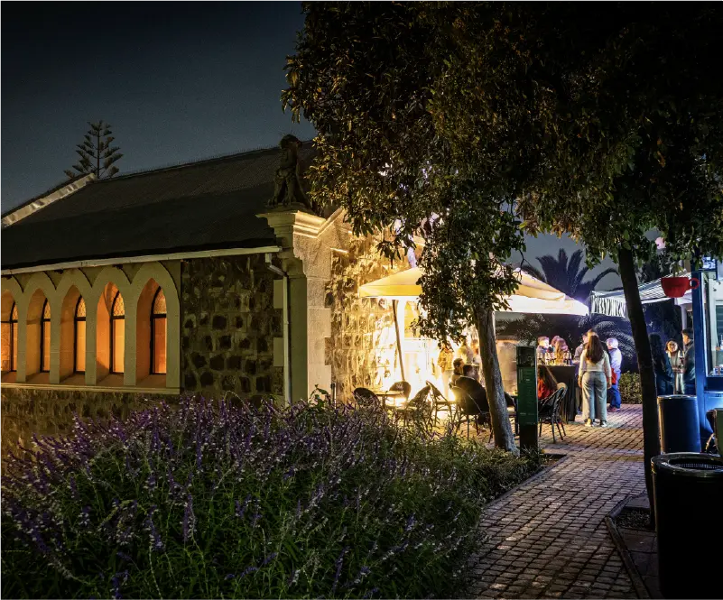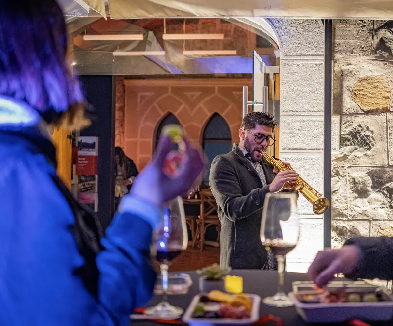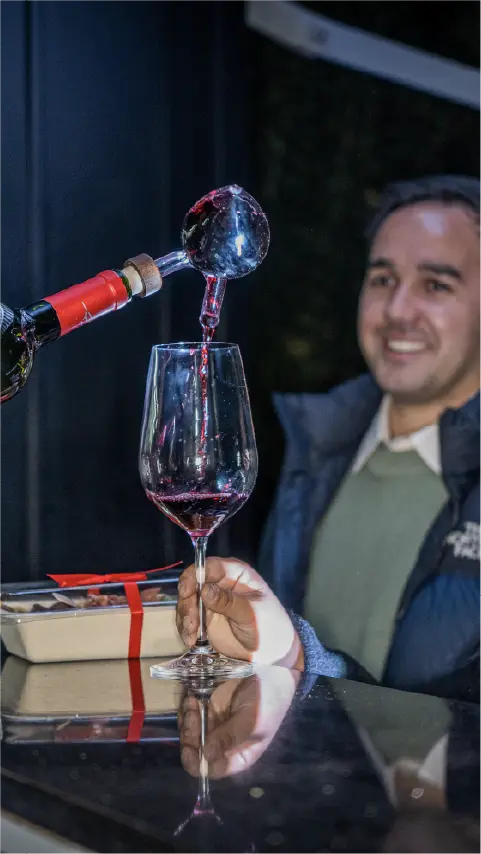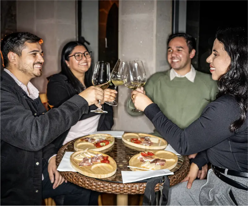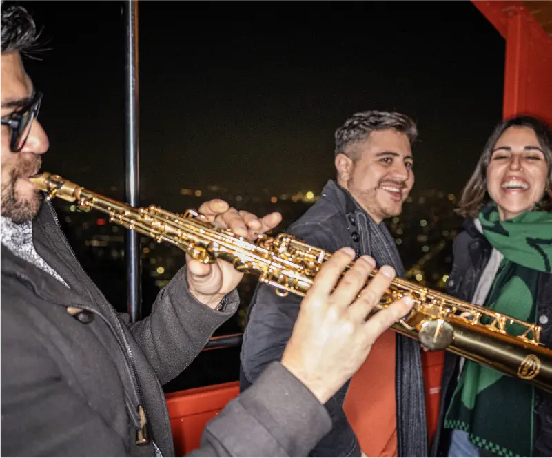La noche parte en el castillo del Funicular, con una recepción guiada por un personaje de época, copa en mano, y una visita al Museo Vivo. Luego, subirás en funicular acompañado por un saxofonista, mientras la ciudad se enciende a tus pies. En la cumbre, te espera una degustación de dos vinos de Viña Casas del Bosque, maridados con bocados especialmente seleccionados en el elegante Salón Tudor.