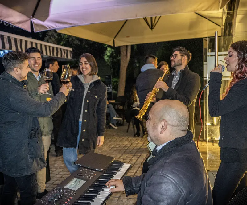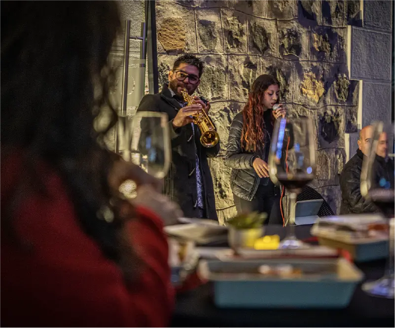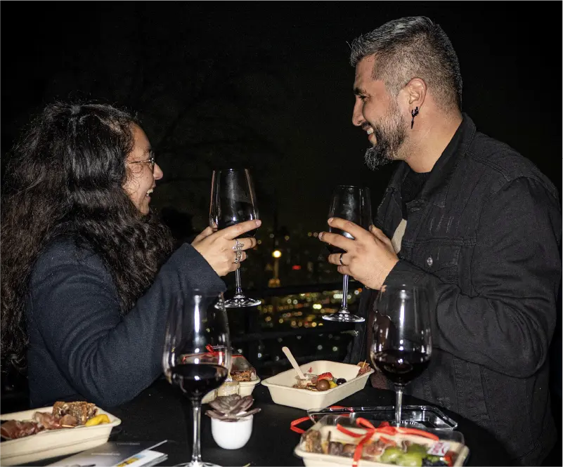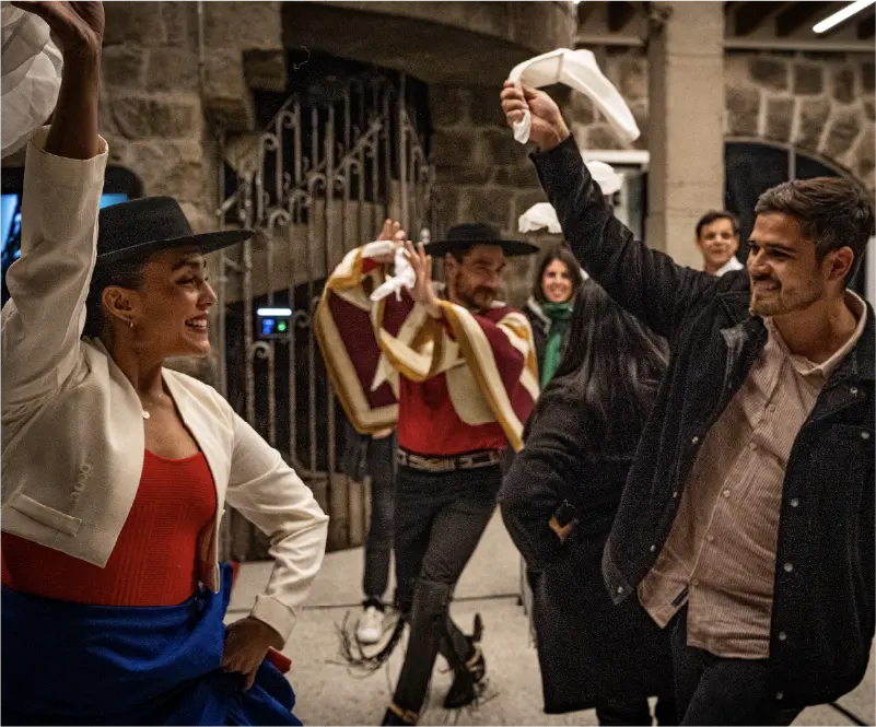 Después, la velada continúa en la terraza con música en vivo y una vista panorámica de Santiago iluminado. El cierre llega con un show de cueca tradicional en el castillo de Funicular. Una noche para disfrutar con todos los sentidos.